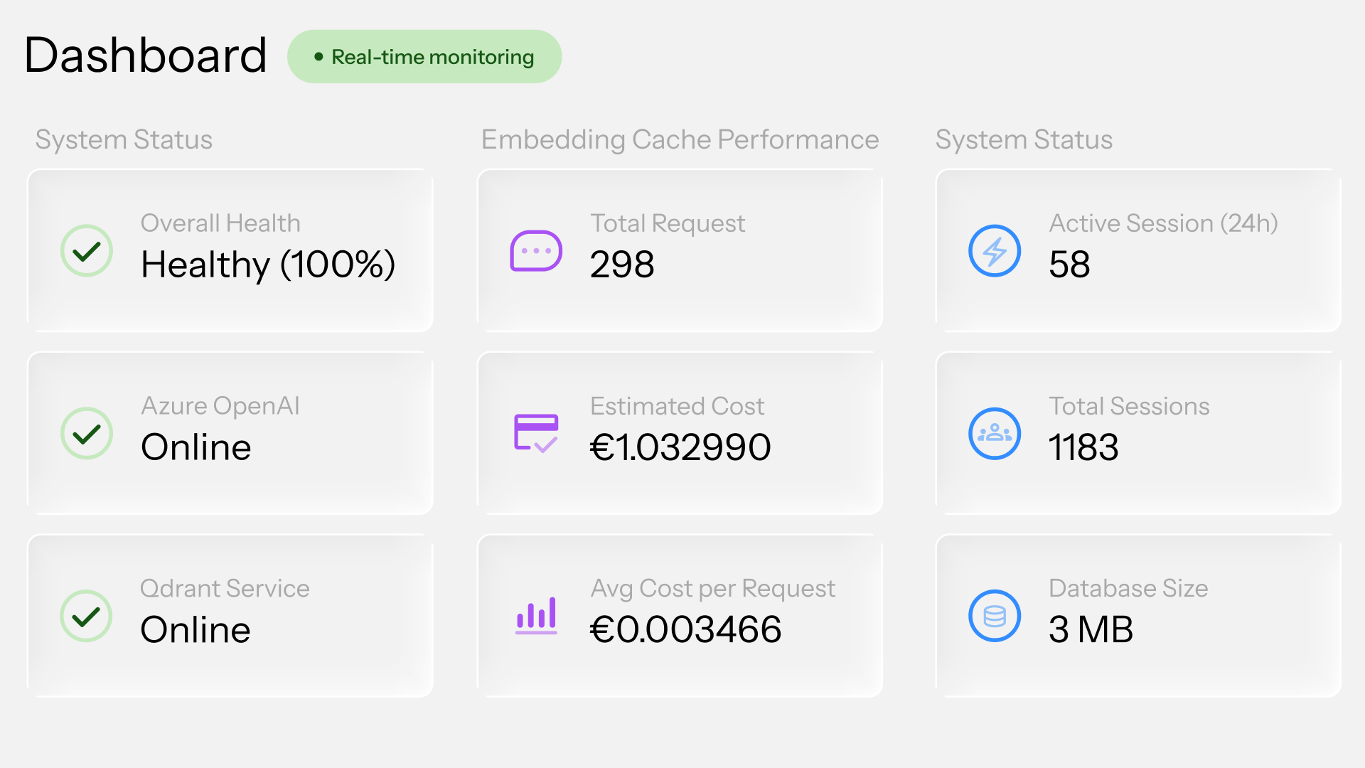 El asistente de IA incluye un panel integrado que muestra todos los datos clave del sistema en tiempo real. Las empresas pueden ver en cualquier momento el consumo actual de tokens, los costes derivados y el rendimiento del sistema. Además, el panel muestra qué contenidos se utilizan con mayor frecuencia o qué preguntas realizan los usuarios que aún no cuentan con contenido adecuado. Una base perfecta para ampliar contenidos y mejorar el asistente de forma continua.
