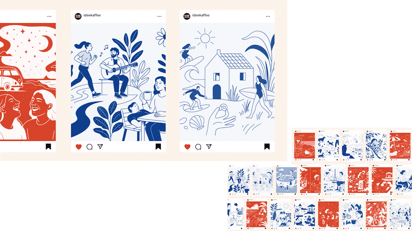 An automated prompt process optimised texts, combined them with defined style prompts and generated consistent visuals in the IDEE KAFFEE look via gpt-image-1. An editorial backend bundled all submissions and turned community content into curated brand communication.